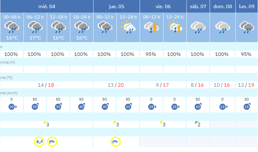 El viernes 6 continuará la inestabilidad, con una probabilidad de lluvia que se sitúa entre el 95% y el 100%, y con la posibilidad de tormentas, especialmente en la primera mitad del día. Aunque podría registrarse un ligero descenso en la intensidad respecto a jornadas anteriores, las precipitaciones seguirán presentes, con temperaturas más bajas, entre los 9 y los 17 grados.