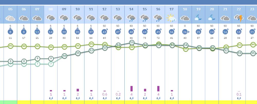Las precipitaciones comenzarán a generalizarse a partir de las 6:00 horas, cuando el cielo pasará a estar completamente cubierto y la probabilidad de lluvia alcanzará el 100%. Este escenario se mantendrá durante toda la mañana y las primeras horas de la tarde, coincidiendo además con viento fuerte de componente oeste.