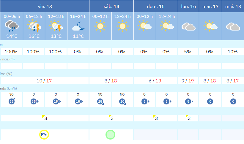 Además de la lluvia, el viernes estará condicionado por el aviso amarillo por viento, que permanecerá activo desde aproximadamente las 03:00 hasta las 18:00 horas. El viento soplará inicialmente de componente suroeste, rolando posteriormente a oeste, con velocidades sostenidas en torno a los 30–38 km/h y rachas que podrán alcanzar los 60–67 km/h, especialmente durante la mañana y primeras horas de la tarde.