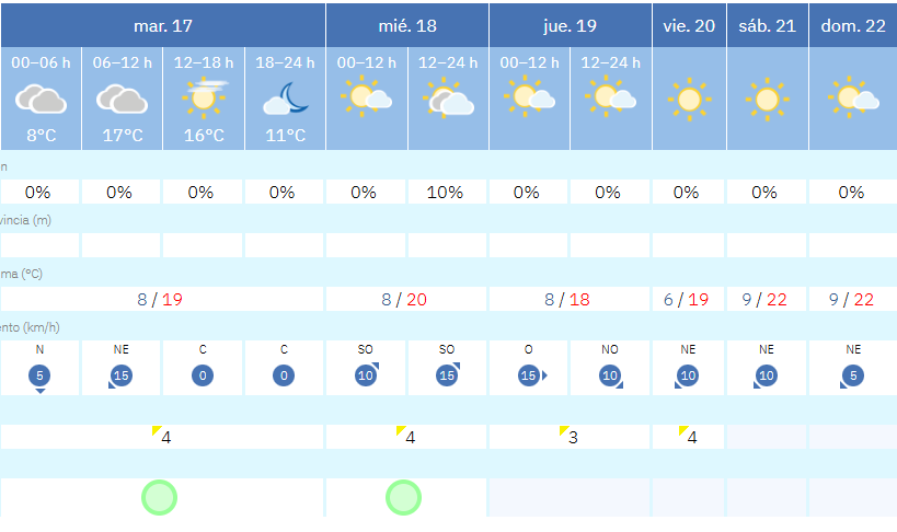 El miércoles se espera ya un ambiente mayoritariamente soleado, con temperaturas mínimas en torno a los 8 grados y máximas que alcanzarán los 20. El viento girará a componente sur y suroeste, con intensidad moderada en algunos tramos del día.