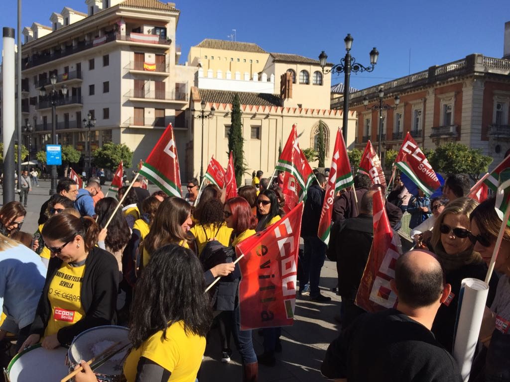 En torno a las doce del mediodía, el 95% de los trabajadores de la plantilla del grupo Arvato, junto a representantes de los sindicatos de UGT y Comisiones Obreras han organizado una marcha desde la Puerta de Jerez hasta el Ayuntamiento de Sevilla, donde varios representantes de los trabajadores se estaban reuniendo con el alcalde, Juan Espadas, para ejercer presión a la empresa.