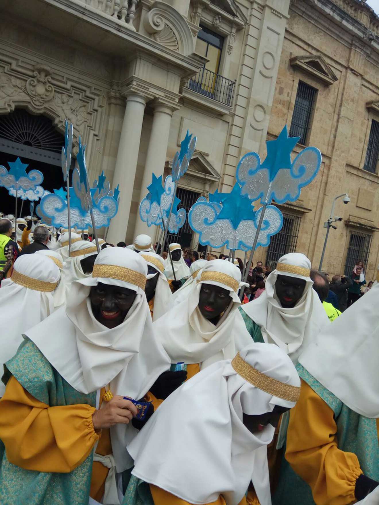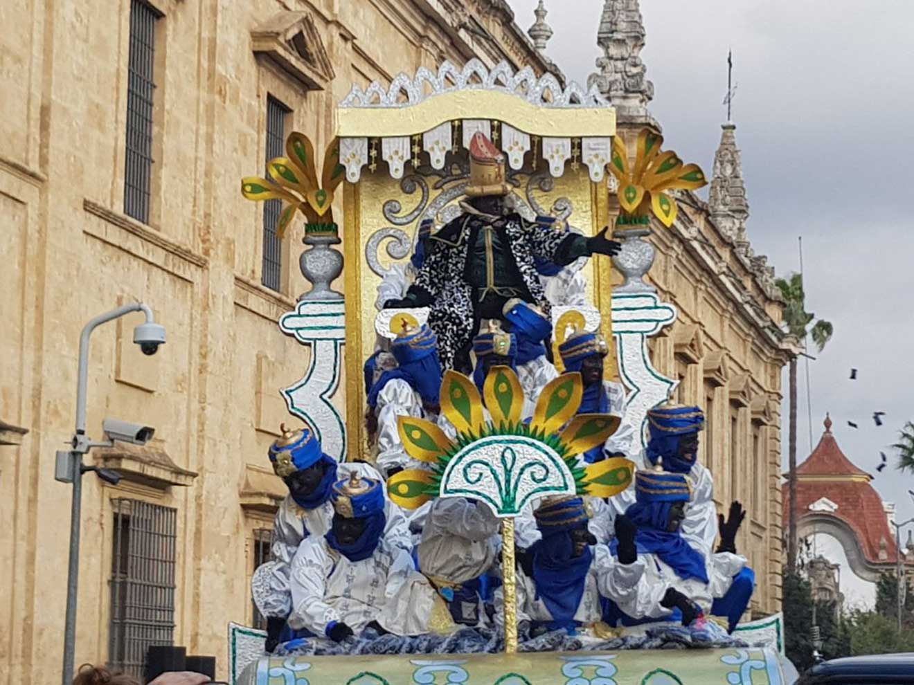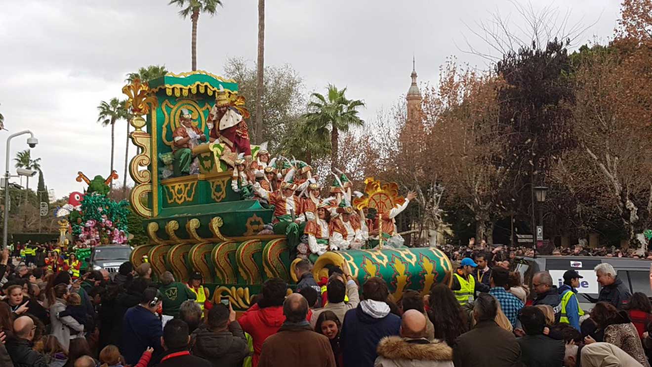 Lluvia de caramelos, pero también lluvia sin más. Sevilla se ha engalanado un cinco de enero más para recibir a Sus Majestades de Oriente en la tradicional Cabalgata del Ateneo, eso sí, más corta y acelerada por el temor a las precipitaciones que se preveían durante toda la semana.