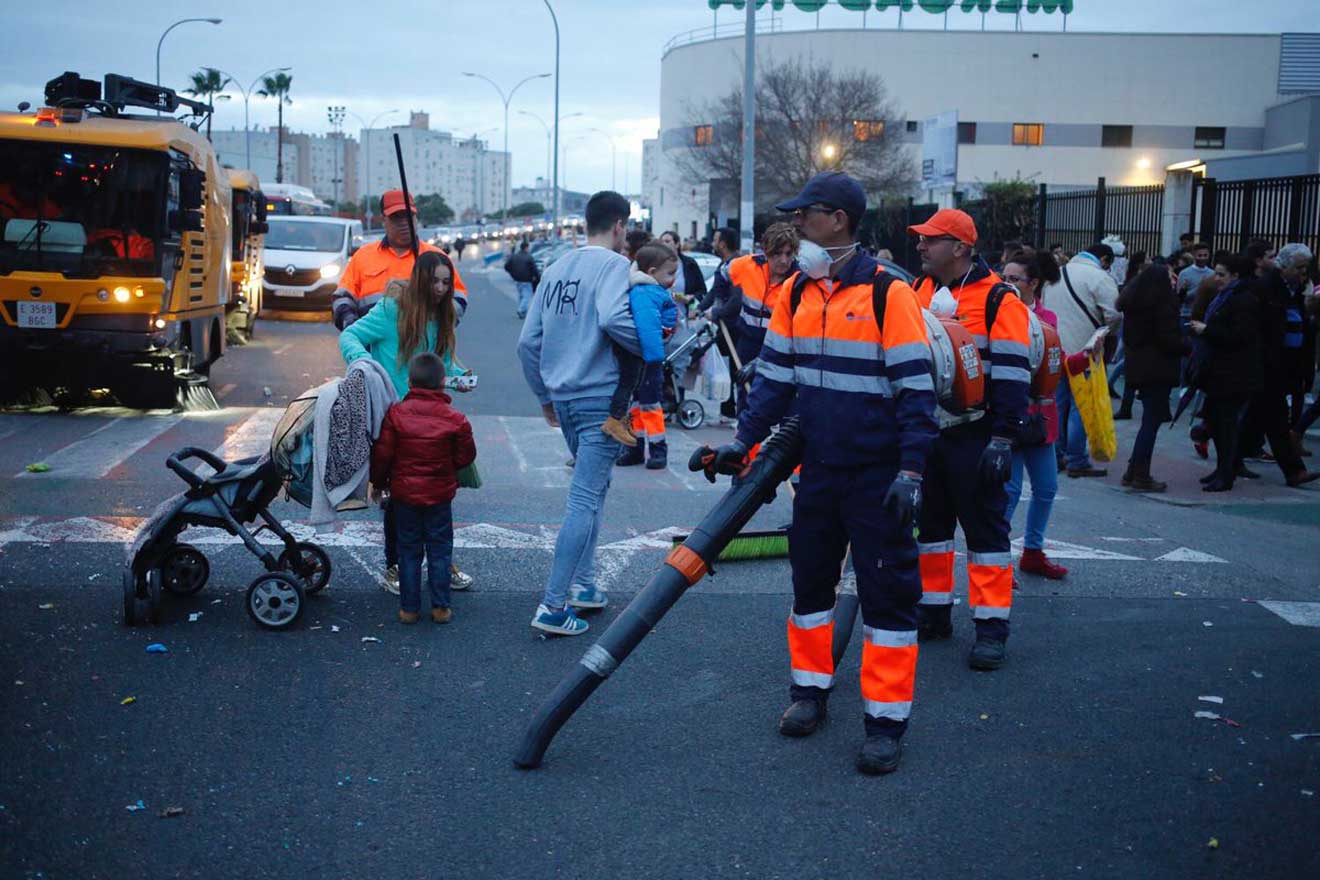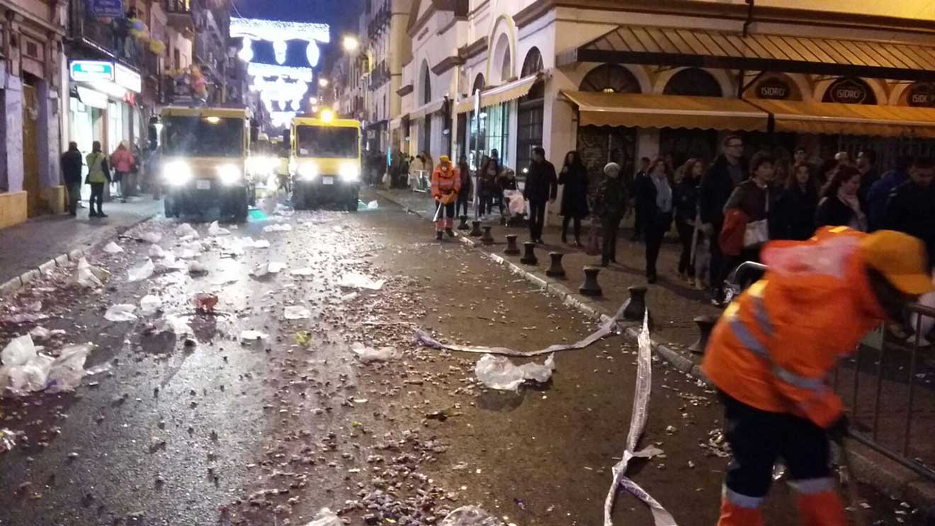 La lluvia hizo acto de presencia en la recta final de la cabalgata, cuando la tregua del cielo pareció terminar y las nubes comenzaron a descargar agua sobre un cortejo desmembrado que en el que la Estrella ya regresaba por la calle Palos de la Frontera, mientras que Baltasar se vio sorprendido bordeando Asunción a paso rápido y Melchor hacía lo propio en el Muelle de las Delicias. Para entonces, los paraguas no recogían caramelos sino que protegían a los asistentes de unas precipitaciones cada vez más copiosas.