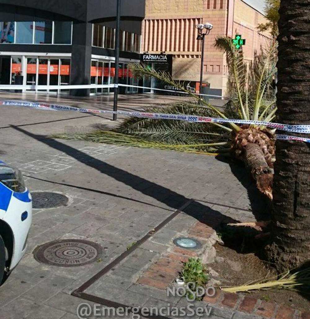 La palmera ha caído al acerado causando graves destrozos en el mobiliario de la vía y obstaculizando la zona. Un edificio de vecinos se ha llevado la peor parte, el párking ha sufrido las consecuencias del desplome, aún está por determinar el número de coches afectados. Desde Emergencias Sevilla, que hoy ha reactivado el plan de emergencias por vientos superiores a los 70 kilómetros por hora, se desconoce el total de los daños y están trabajando para normalizar esta y otras incidencias.