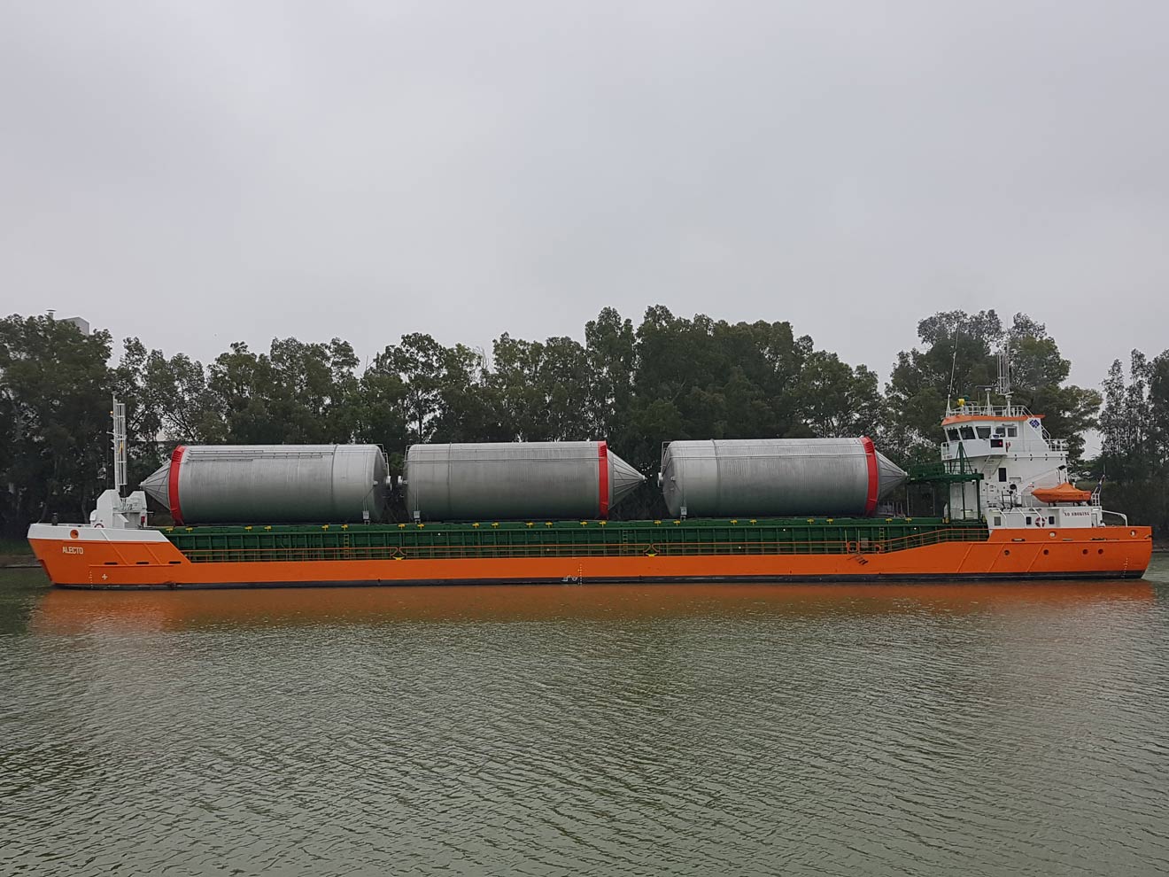 El Puerto de Sevilla ha recibido este miércoles tres tanques de fermentación para la planta cervecera de Heineken. Con una capacidad de 5.500 hectólitros cada uno, estos grandes depósitos de acero han llegado al Muelle de Tablada transportados en la superficie del buque Alecto, consignado por la empresa Sevilla Shipping.