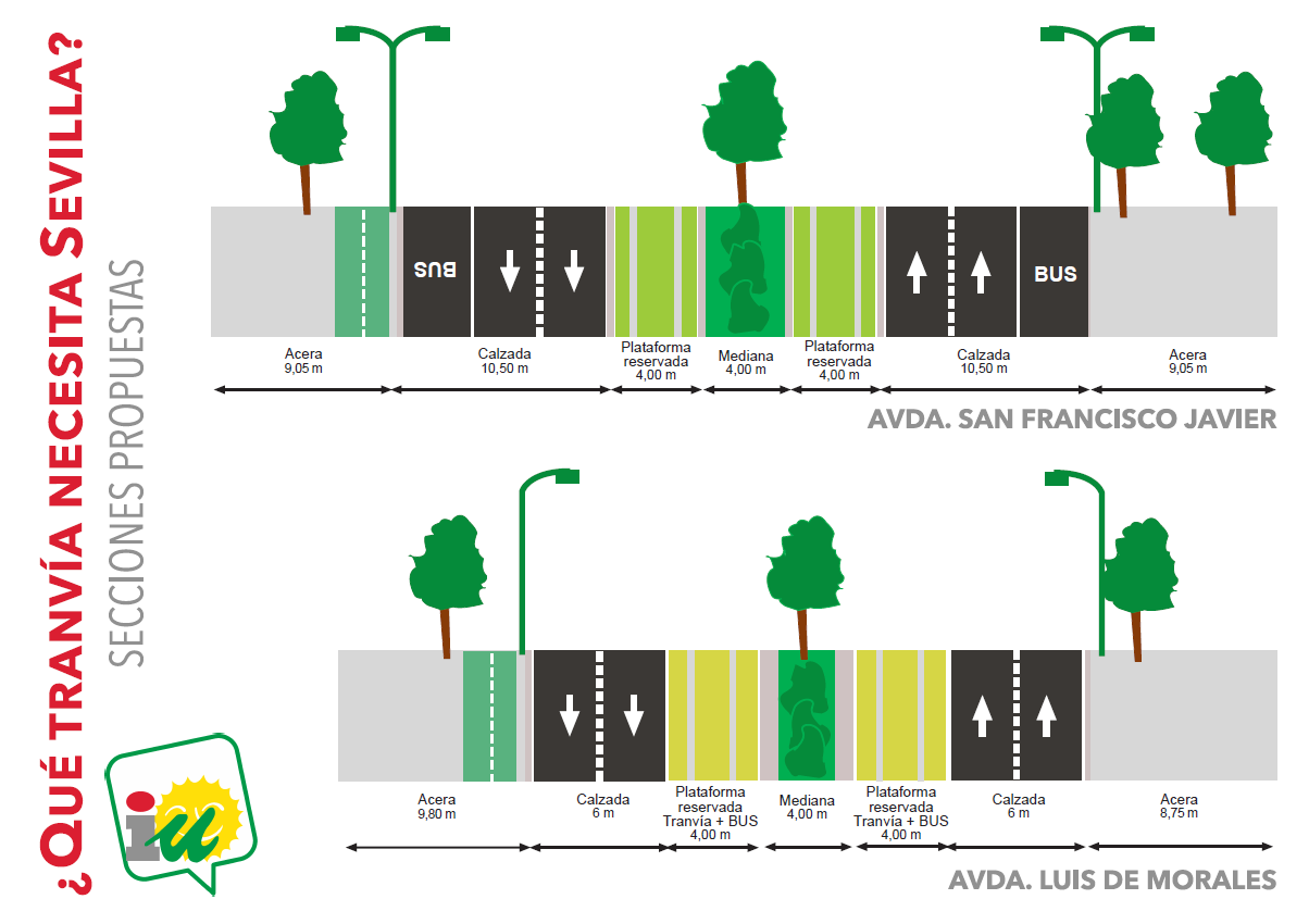 IU ha formulado 14 alegaciones al proyecto de trazado elegido por el Ayuntamiento de Sevilla para la ampliación del tranvía desde la parada de San Bernardo hasta el entorno de Santa Justa, a través de las avenidas San Francisco Javier y Luis de Morales, rechazando el paso subterráneo incluido en el proyecto y apostando por mantener las medianeras y zonas verdes de las citadas vías, a costa de los carriles de tráfico rodado.