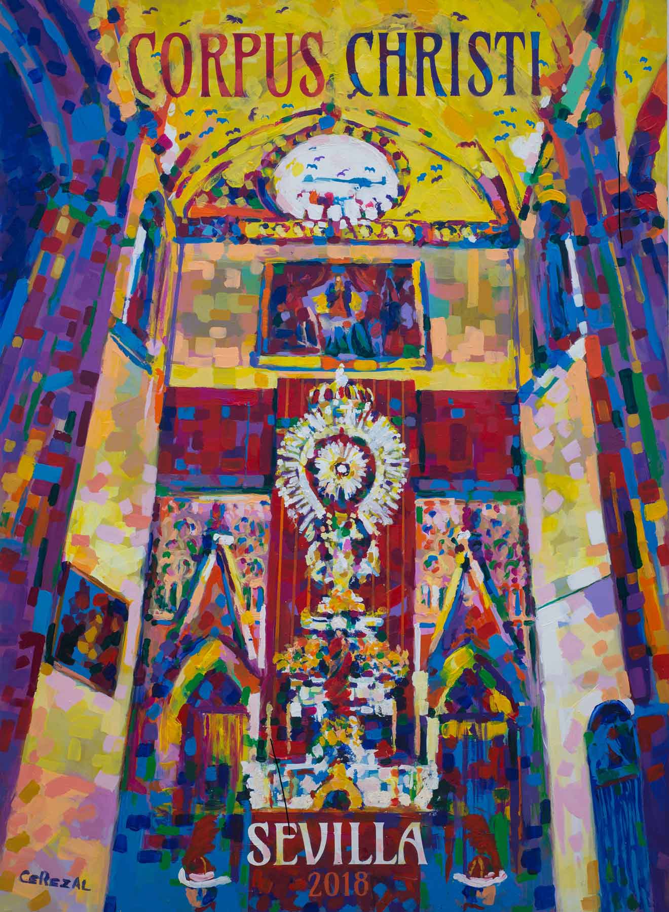 El Ayuntamiento de Sevilla, a través de la Delegación de Seguridad, Movilidad y Fiestas Mayores, ha presentado hoy el cartel del Corpus Christi de 2018, una obra en la que se puede observar el personal estilo de su autor, José María Jiménez Pérez-Cerezal, al tiempo que muestra influencias del postimpresionismo.