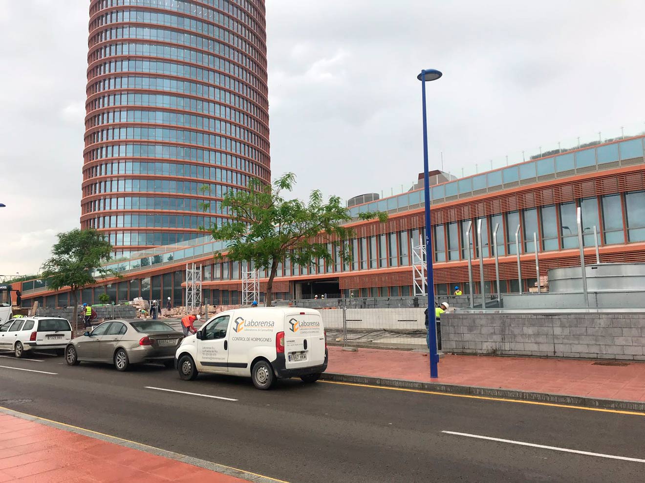 En la mañana de este viernes se ha podido ver a varios operarios instalando lo que parece ser una marquesina de entrada al área comercial del recinto Torre Sevilla (propiedad de CaixaBank), que incluye también el rascacielos (con las oficinas y el hotel de cinco estrellas), el CaixaFórum y el recién inaugurado Parque Magallanes.