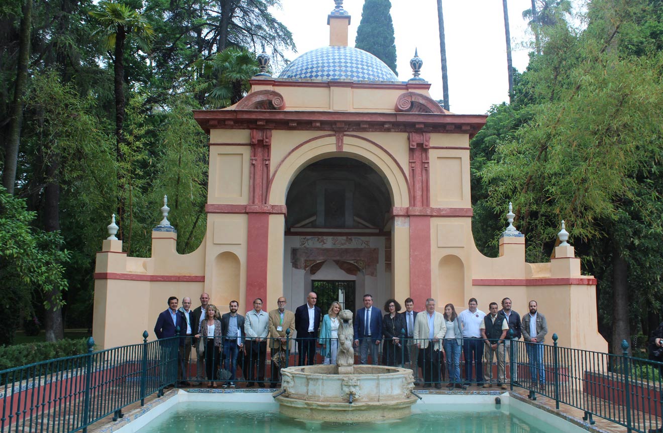 El alcalde de Sevilla, Juan Espadas, ha visitado este viernes los jardines de los Reales Alcázares junto al concejal de Cultura y Turismo, Antonio Muñoz, el alcaide del monumento palaciego, Bernardo Bueno, y la arquitecta Dolores Robador, encargada de la actuación de restauración acometida desde julio de 2017 en el espacio conformado por el Cenador del León, el estanque ubicado frente a dicho pabellón y el jardín que acompaña a estas construcciones.