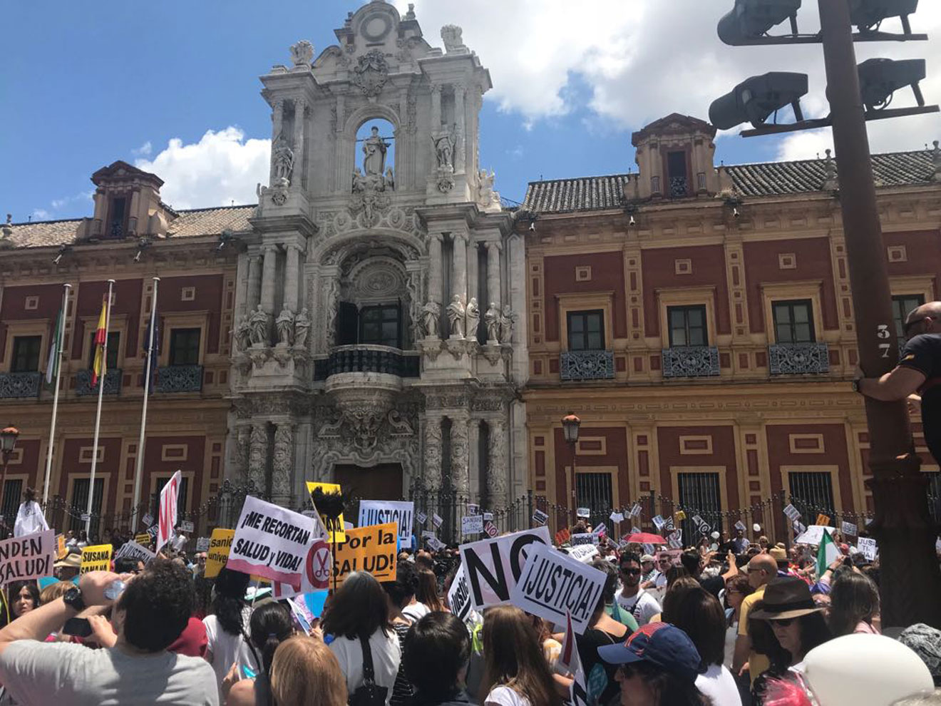 Miles de personas se han acercado en la mañana de este domingo hasta la Plaza Nueva y el centro de Sevilla con motivo del inicio de la gran manifestación por una sanidad pública, universal, gratuita y de calidad, organizada por varios colectivos como Justicia por la Sanidad o Marea Blanca.