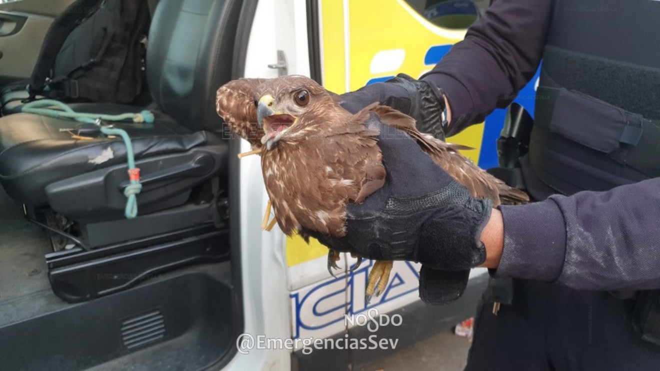 Agentes de la Policía Local han rescatado en Nervión a un ejemplar de águila ratonera, una especie protegida, que se encontraba herida y perdida en la zona. Así ha sido la intervención.