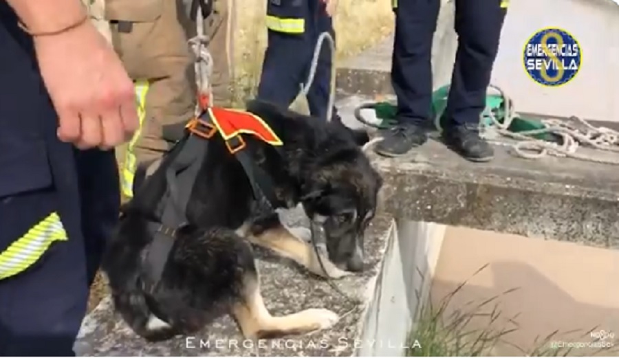 Efectivos de bomberos y agentes de la Policía Local de Sevilla rescataron este domingo a un perro que había sido arrastrado por la corriente del agua hasta una zona de compuertas, tras caer al cauce del canal en Torreblanca.