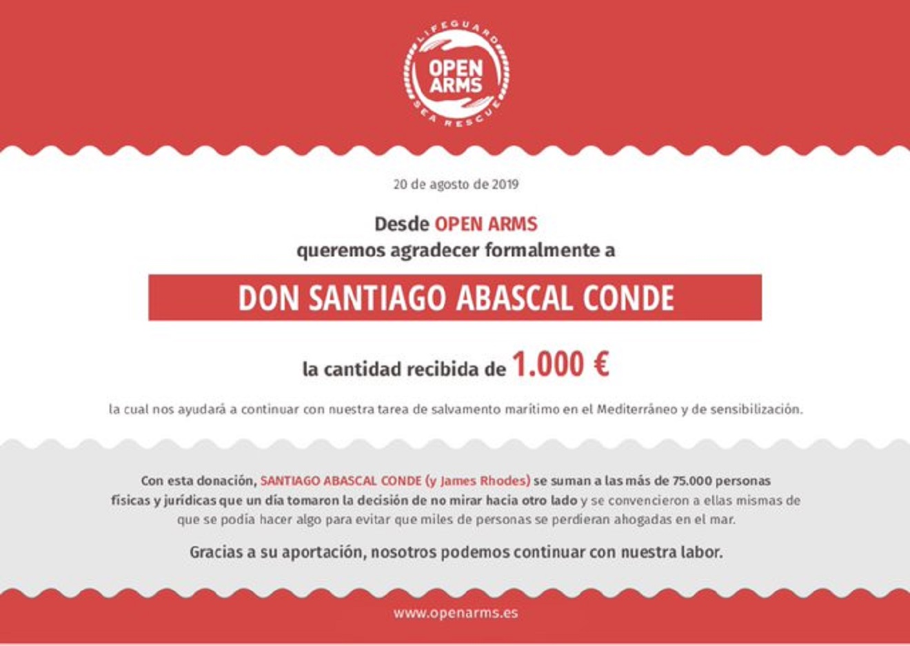 Publicado enEspaña Donan 1.000€ al Open Arms a nombre de Santiago Abascal por Sevilla Actualidad 21 agosto, 201921 agosto, 2019