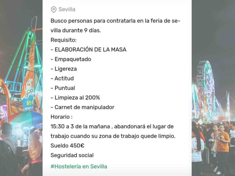 Publicado enSevilla Nueve días de trabajo en la Feria de Sevilla, doce horas diarias, por 450 euros por Alba Canovaca 27 marzo, 202227 marzo, 2022