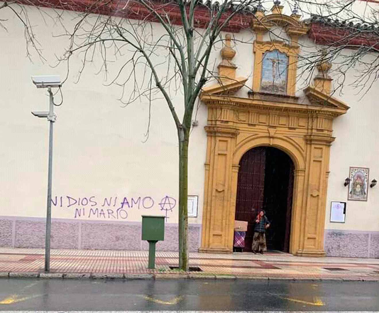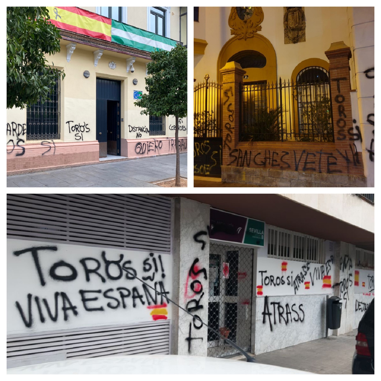 Sobre las tres de la pasada madrugada, agentes de la Policía Local de Sevilla, Cuerpo adscrito a la Delegación de Gobernación y Fiestas Mayores del Ayuntamiento, detectaron in fraganti a tres varones que estaban realizando pintadas en la sede del PSOE de la Av. Luis Montoto, nº 8, utilizando para ello botes de spray de pintura, de colores negro, amarillo y rojo, con leyendas a favor del mundo taurino.