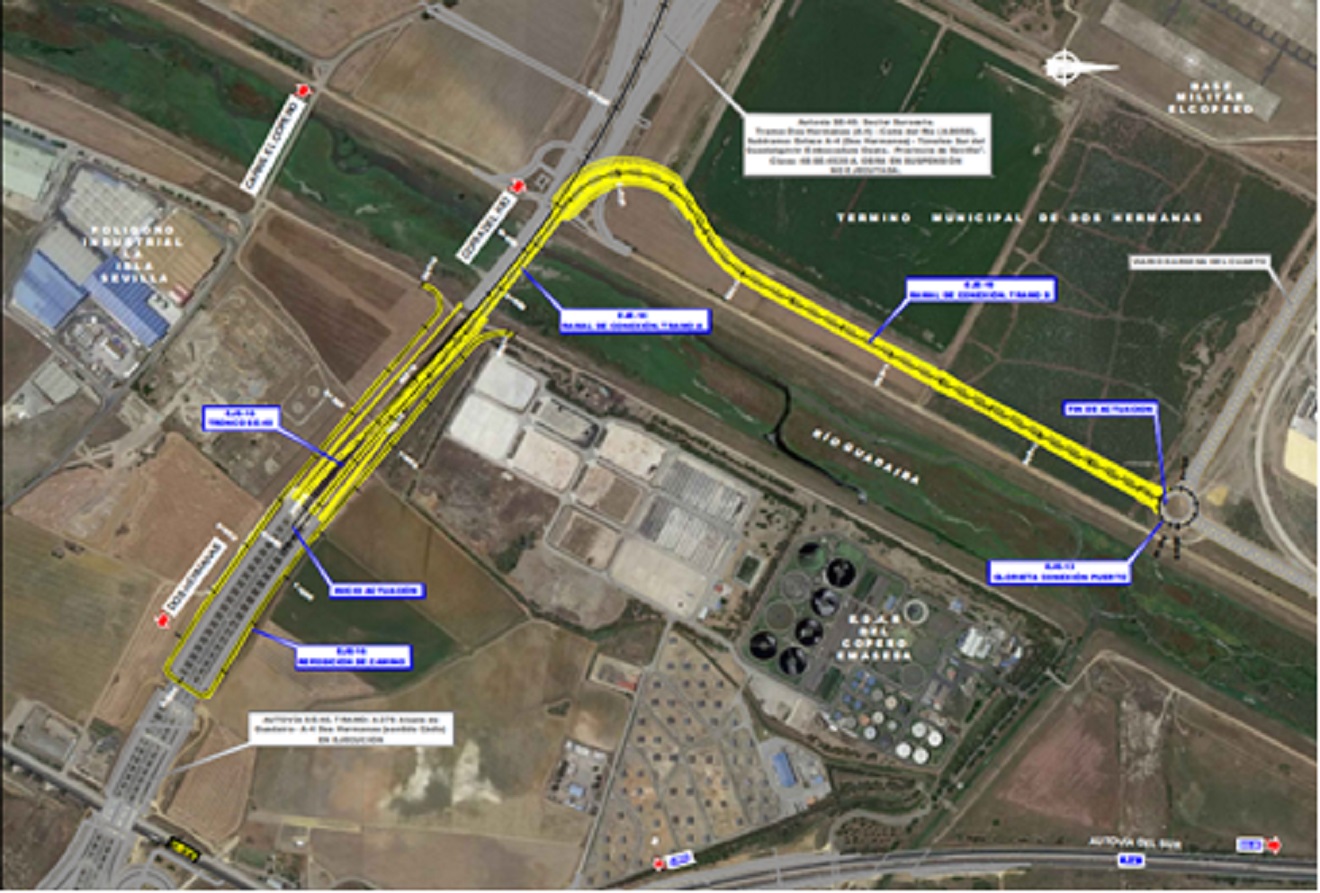 El Ministerio de Transportes, Movilidad y Agenda Urbana avanza en la construcción de las conexiones para establecer un «by-pass» entre las autovías SE-30 y SE-40 que permita desviar parte del tráfico del Puente del Centenario con vistas a la sustitución de sus tirantes.