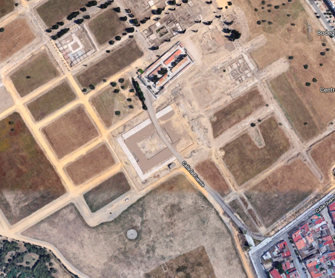 El camino prolongación de la calle La Fuente que conecta Santiponce con el cementerio municipal cruza el templo mayor del conjunto arqueológico.
