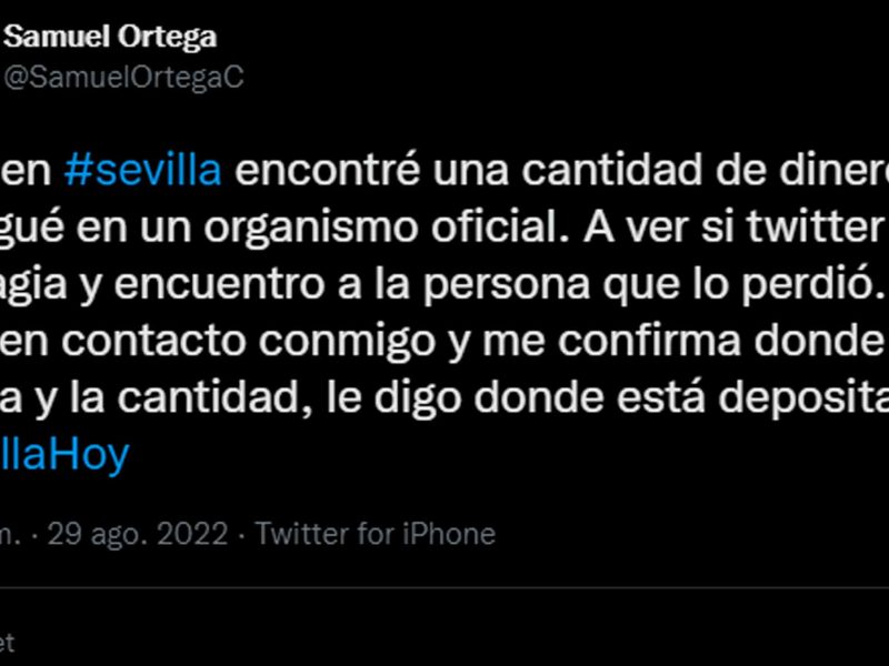 Publicado enSevilla Encuentra dinero perdido en Sevilla y busca al propietario en Twitter por Redacción 30 agosto, 202230 agosto, 2022